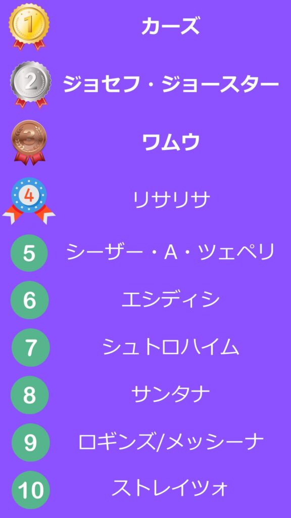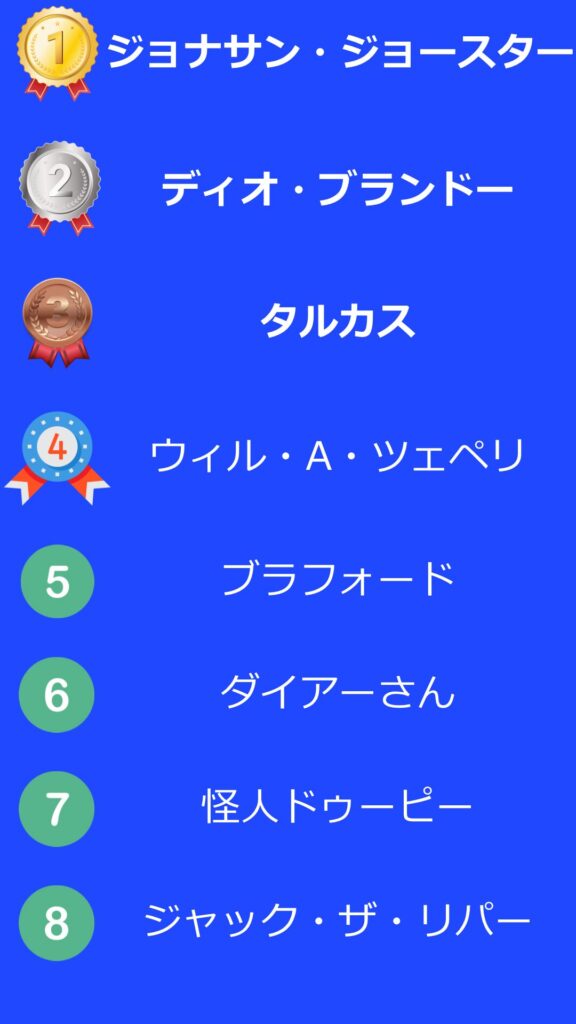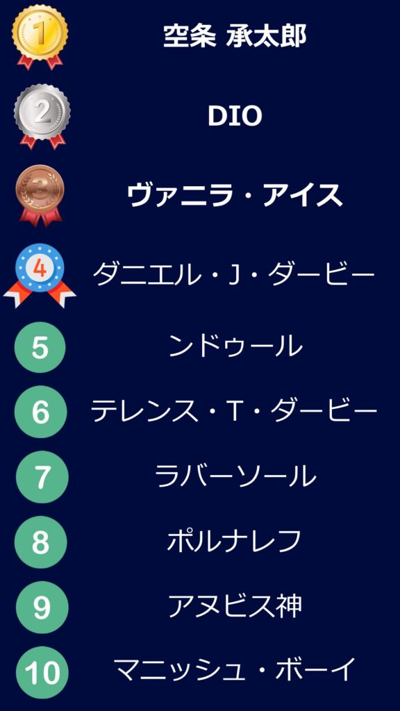 ランキングは6部までに登場したキャラで作っています。