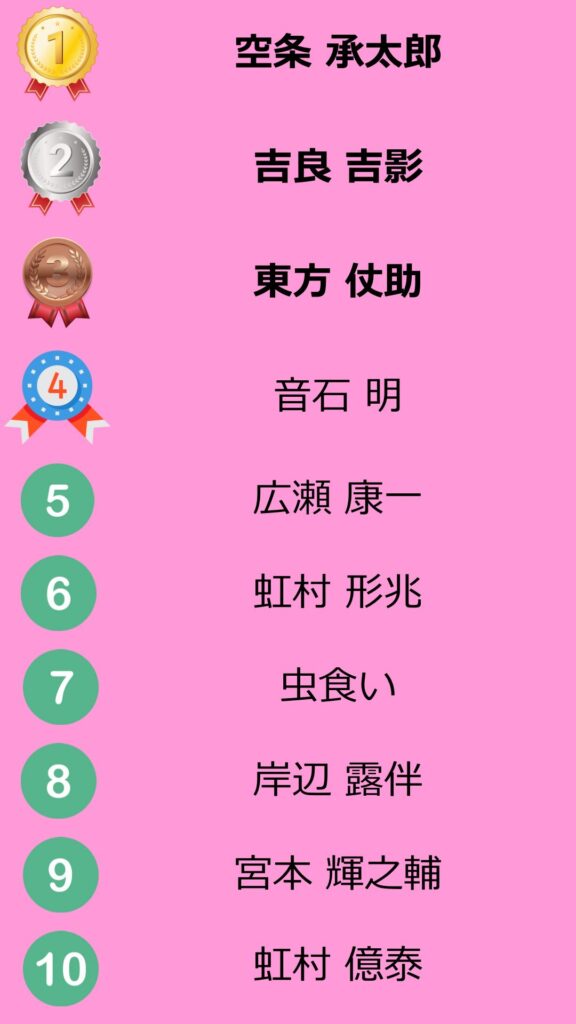 康一くんはかなり活躍していたため5位にしましたが、少々過大評価かもしれません。